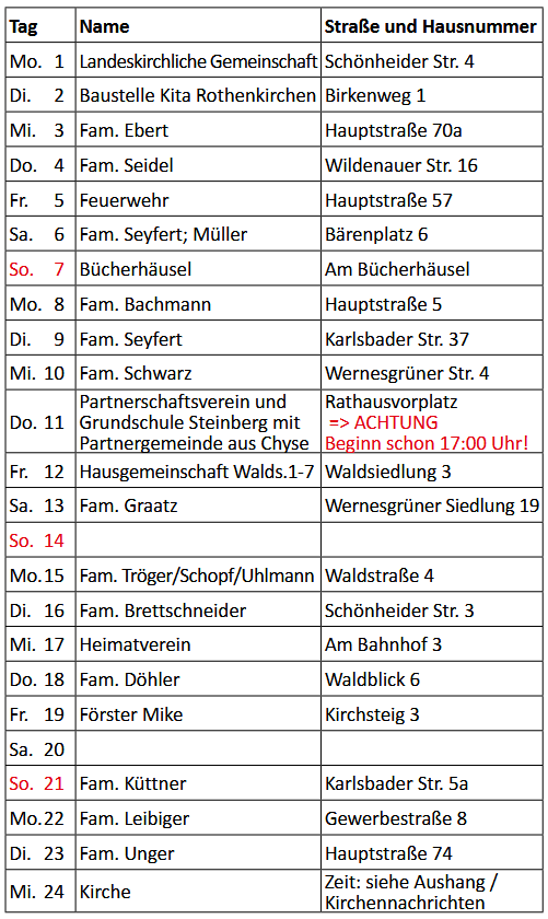 Leider haben sich nicht für jeden Tag Mitstreiter gefunden. Wenn noch die restlichen Tage besetzt